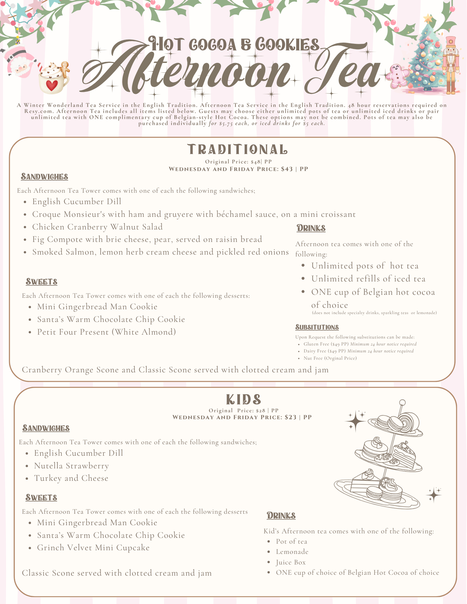 January reservations are CLOSED, we will be closed for afternoon tea for January. We will be back open for afternoon tea reservations February 1st.
