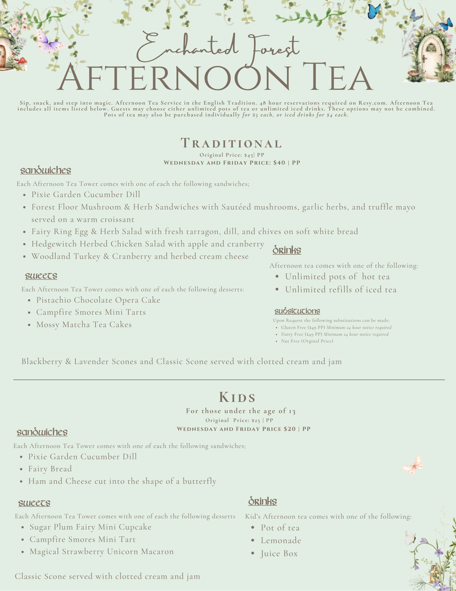 Enter... if you dare, for a hauntingly elegant tea service inside the ghostly halls of our timeworn manor. Enjoy spine-tingling savories, phantom-inspired sweets, and sinister sips that just might raise the dead (or at least your pinky).